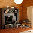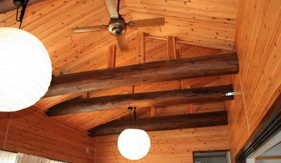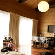 玄関から見ると、中庭と廊下を挟んで反対側に太く大きな丸太梁を使ったリビングがある。建築的な観点からすると梁はその寸法が大きくなればなるほど、大きな空間を作ることができる。この丸太梁には、社長自ら山に入り選びに選び抜いた木材を使用しているそうだ。実際、リビングに入るとその天井の高さと質感は圧巻だ。天然の木材を使うことで、ボードや壁紙で装飾された空間とは異次元の気品が漂ってくる。気がつくと、先ほどの美しい中庭から、心地よい風と光がリビングに入ってきて、何ともいえない幸せな気持ちにさせてくれる。