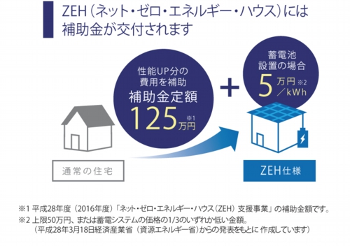 つまり、高断熱の建物と高効率の設備の省エネ性能の向上により、消費するエネルギーを削減し、太陽光発電等による創エネで、年間の正味のエネルギー消費量を"ゼロ"にしていくということです。