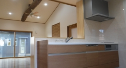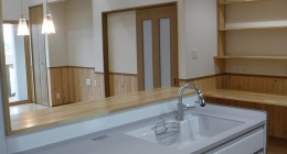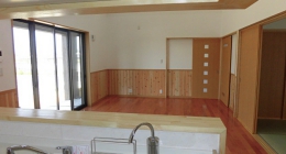 対面式のキッチンと家族みんなで過ごす場所。リビング南側には並行に並んだ床の間付きの和室と一体的に作られたウッドテラス。