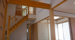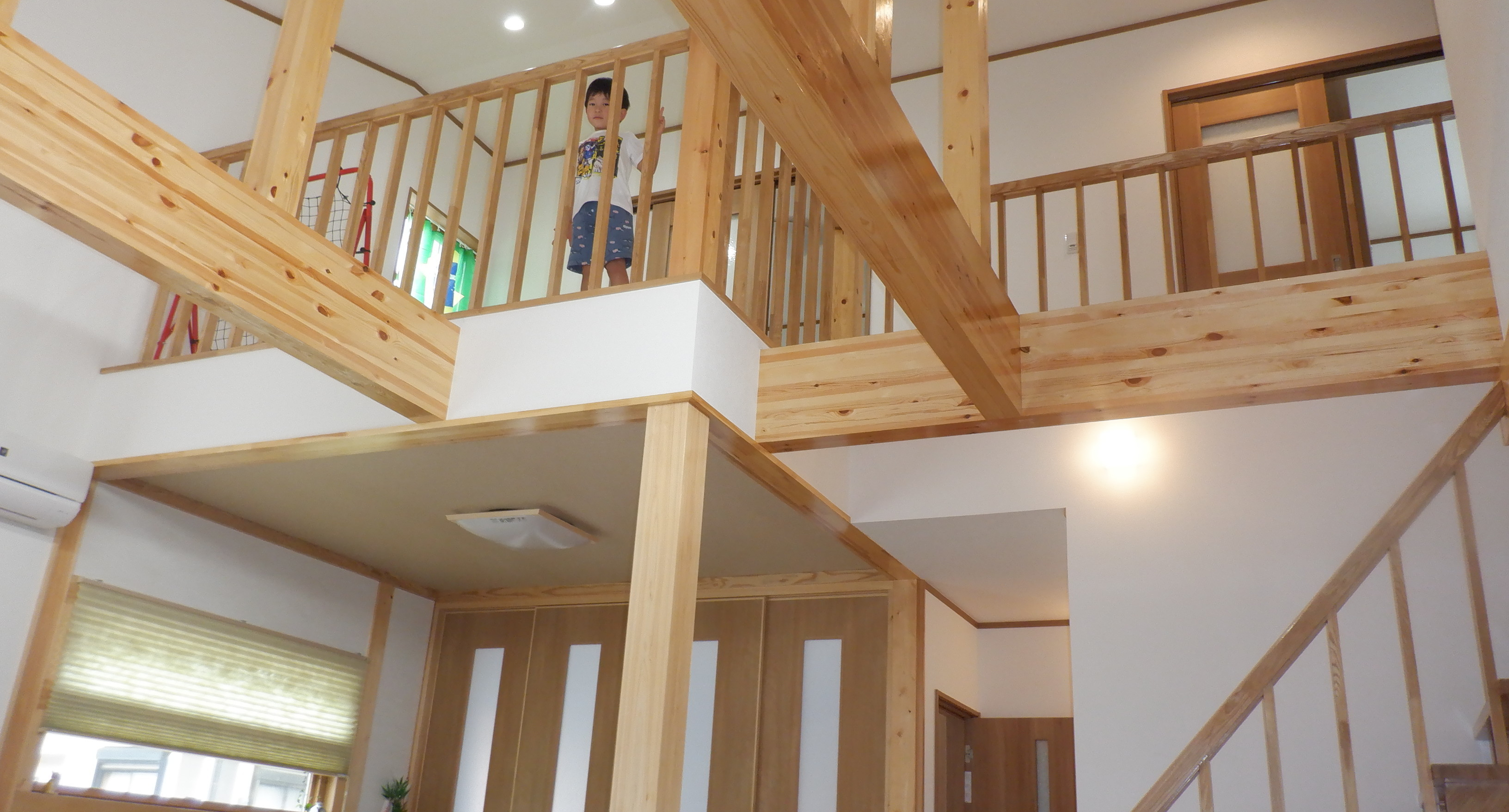 吹き抜けに化粧丸太を通し階段下には収納スペースはもちろん壁には飾棚.と遊び心ある造りに。