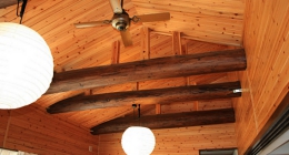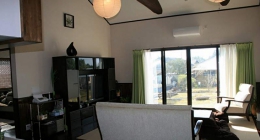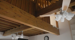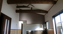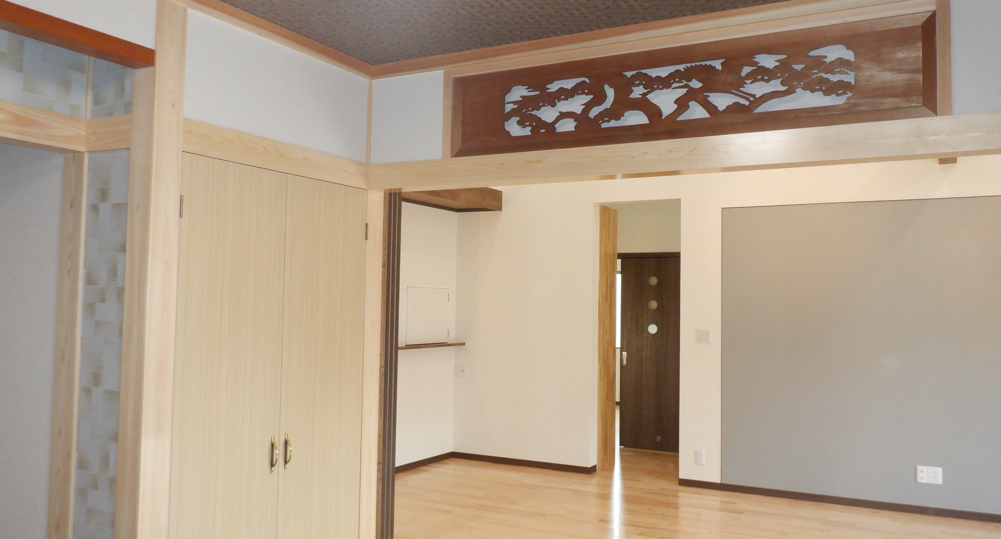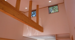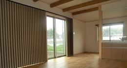 ゆとりある空間とゆったりとしたリビング。隣接された琉球畳の和室。その和室より眺める大きな丸太梁と桁は圧巻