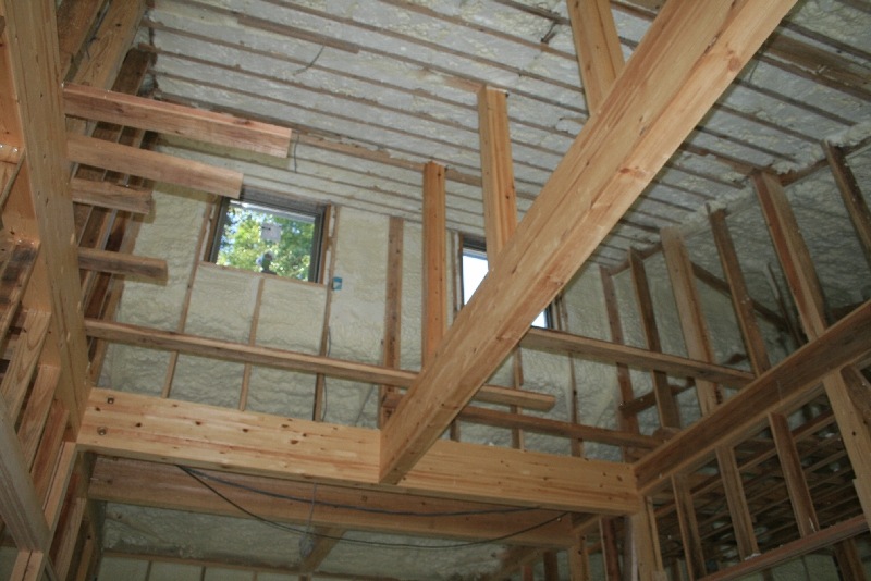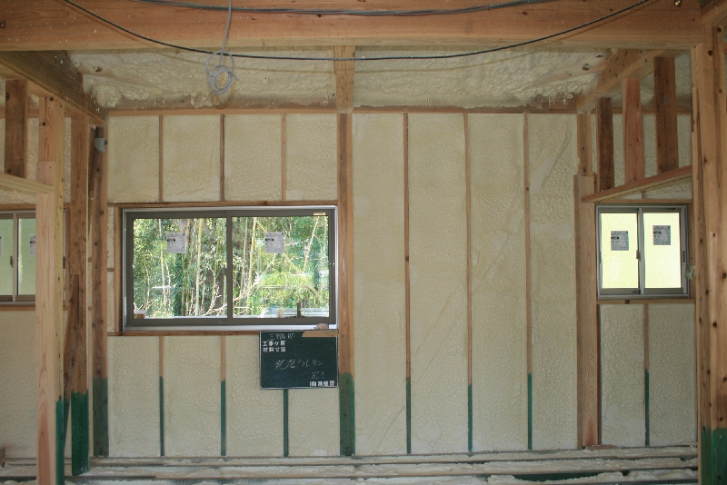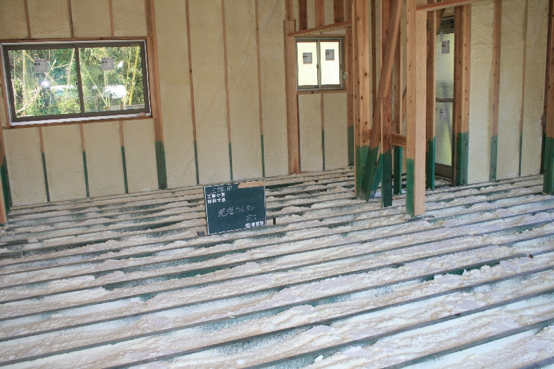 優れた断熱・気密性を発揮する「発泡断熱施工」を採用しています。発泡断熱材によって外気との無駄な熱交換がなくなり、家中の温度差の少ない快適な住空間が生まれます。居室やトイレそれに浴室・洗面所等に隙間のない構造で家中を覆うので、冬場も暖房で温めた空気が逃げにくく家中が温か。底冷えや部屋によって温度差が生じるヒートショックも起こりにくいためお年寄りや冷え性の方にも安心・快適な住まいであるといえます。現場吹付け発泡により、木造の下地に直接吹き付ける為、柱や下地材等の細かい隙間も覆い、ウレタン樹脂で形成された気泡構造なので、