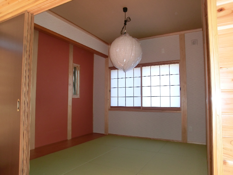 床板に淡い本物の桜材の床板を使用し、壁一面に杉板を使用。