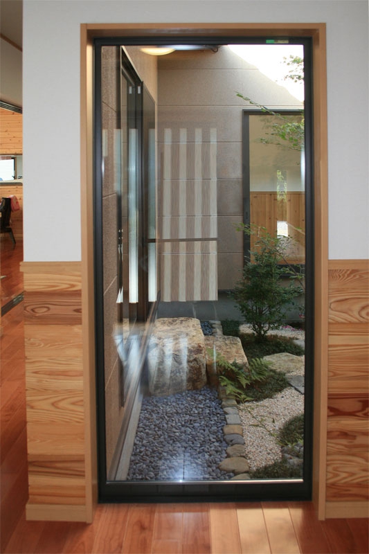 玄関を入るとすぐ目の前に中庭が見える。中庭という小空間を持つ事により、光と風を室内へ入れて、快適な住環境を整える。これは日本人が昔から持っていた知恵である。